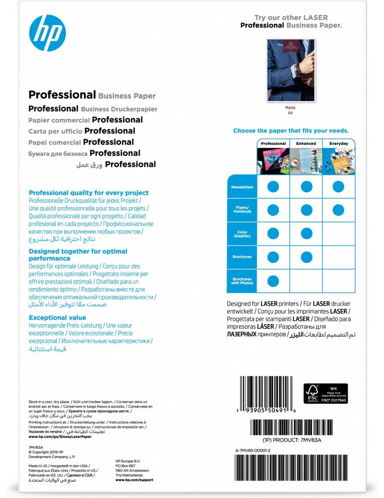 HP Professional Business Paper, Glossy, 200 g/m2, A4 (210 x 297 mm), 150 sheets. Utilizare recomandată: Imprimare laser, Mărime hârtie: A4 (210x297 mm), Terminarea dactilografierii: Glasată. Lăţime de ambalaj: 296,9 milimetri, Adâncimea de ambalaj: 210,1 milimetri, Înălţime de ambalaj: 31,2 milimetri. Greutate brută palet: 609,6 g, Cutii ambalaj (exterior) per palet: 54 buc., Greutate netă cutie ambalaj (exterior): 10,69 g. Produse per palet: 270 buc., Cantitate per ambalaj: 1 buc.. Dimensiuni palet (L x l x H): 1199,9 x 800,1 x 1201,67 milimetri