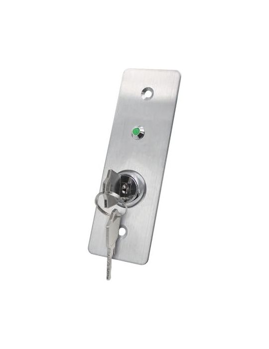 Buton de iesire cu cheie facbricat din inox 304, montaj aparent, folosit in sisteme de control acces.Tensiune functionare: 12 - 24 VccTip contact: NO/NC/COMMaterial: inox 304 1.8 mm grosimeDimensiuni: 115 x 40 mmDurata de viata mecanica: testat 500.000 cicluriTemperatura operare: -20 °C ÷ +55 °CUmiditate in operare: 0 ÷ 95 %Altele: LED: rosu - standby; verde - actionat