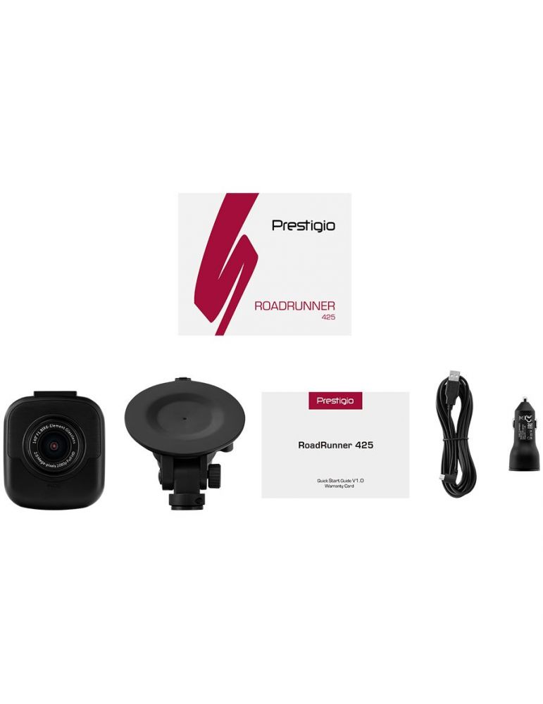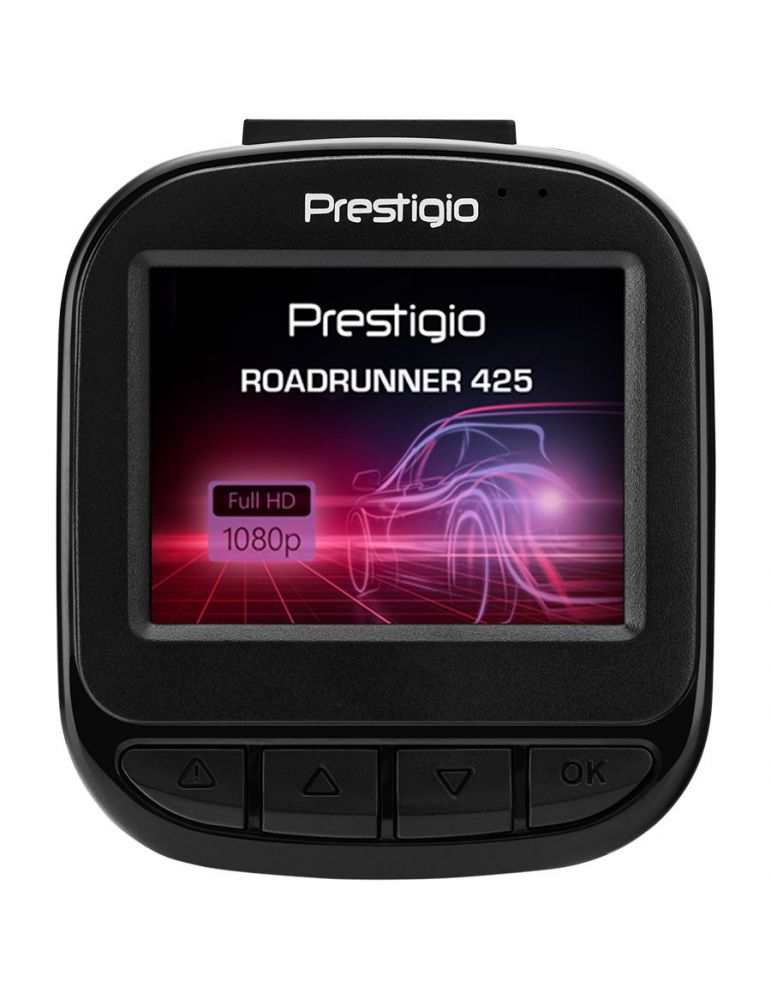 Prestigio RoadRunner 425, 2.0'' LCD (960x240) display, FHD 1920x1080@30fps, HD 1280x720@30fps, GP5168, 2.0 MP CMOS GC2023 image sensor, 2 MP camera, 140° Viewing Angle, 340 mAh, OVP, NTC, Motion Detection, G-sensor, Cyclic Recording, color/Black, Plastic case