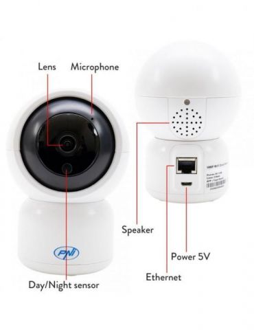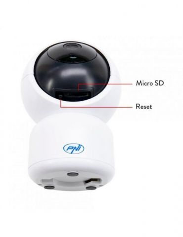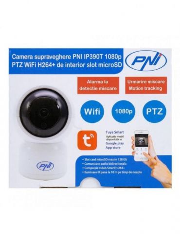 Camera supraveghere video PNI IP390T 1080P cu PTZ WiFi H264+ suporta microSD 128GB Night Vision aplicatia Tuya P2P Android iOS pentru interior rotire dupa miscare alarma la miscare Senzor imagine:1/2.9 CMOS F37 2MP Rezolutie: 1080P (1280 x 1080) Lentila: 3.6mm Compresie: H.264+ Microfon integrat Difuzor integrat Retea: 10/100 Mbps RJ-45 Wireless: 2.4 Ghz 802.11b/g/n MicroSD maxim 128GB (cardul nu este inclus) IR:pana la 10 m