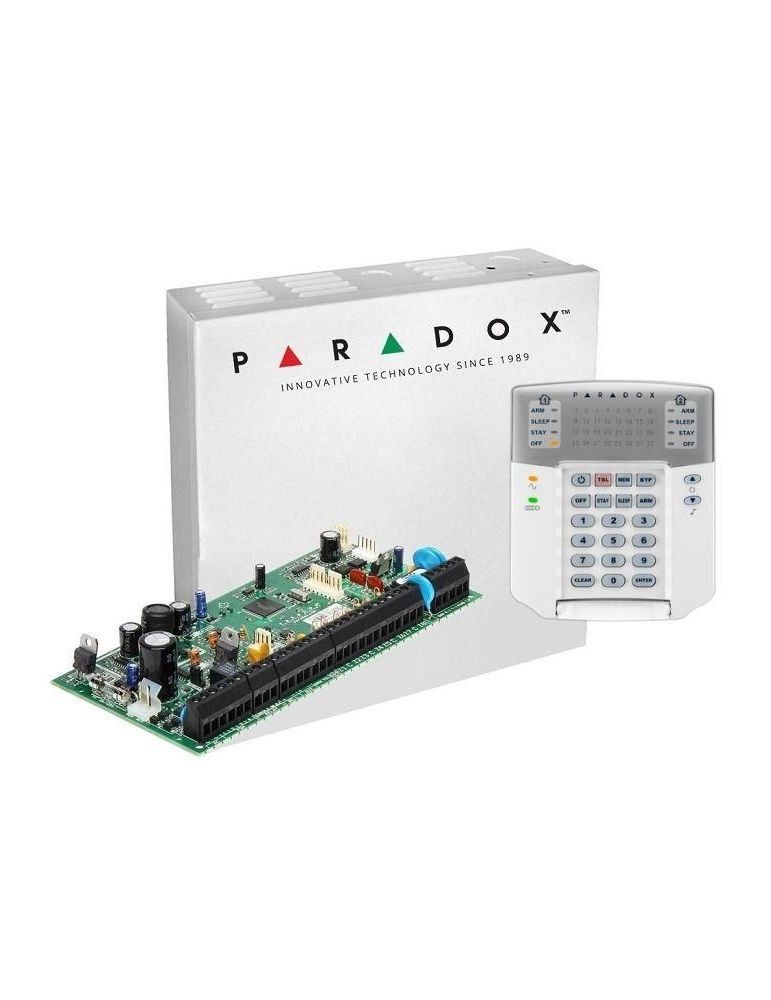 Centrala Paradox SP6000+; 8 zone pe placa (16 cu dublare zona ATZ);2 PGM pe placa, extensibile la 16 (dintre care oricare poate fi wireless);Actualizare firmware local via BabyWare;Numere de telefon raportare: 3 pentru stația centrală, 5 personale, 1 pager;Include cutie cu traf 1 buc si tastatura K32+ 1 buc