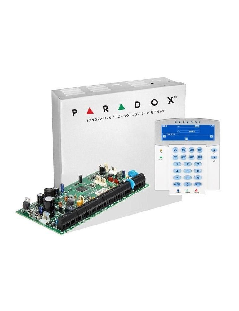 Centrala Paradox SP6000+; 8 zone pe placa (16 cu dublare zona ATZ);2 PGM pe placa, extensibile la 16 (dintre care oricare poate fi wireless);Actualizare firmware local via BabyWare;Numere de telefon raportare: 3 pentru stația centrală, 5 personale, 1 pager;Include cutie cu traf 1 buc si tastatura K35 1 buc