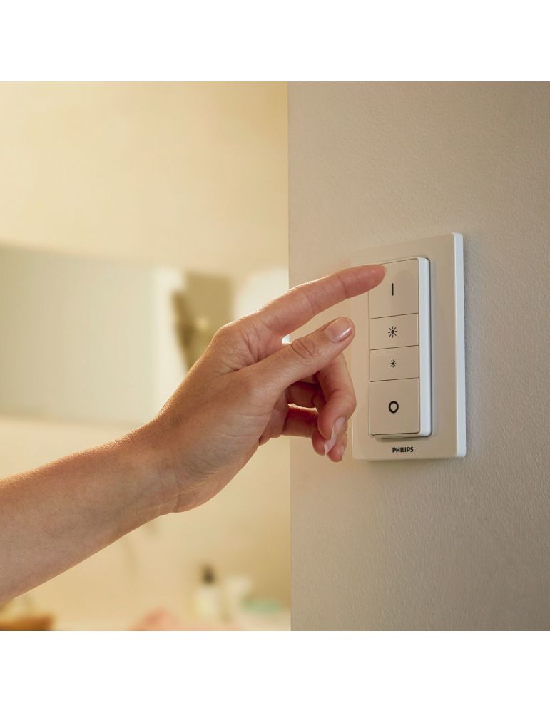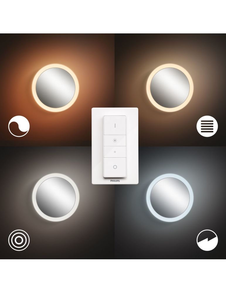 Pentru o rutină de dimineață și de seară mult mai plăcută, alege oglinda de toaletă iluminată Adore, o oglindă mare, rotundă de baie înconjurată de un inel de lumină albă de la caldă la rece. Controlează cu întrerupătorul cu variator Hue dimmer switch inclus sau cu Bluetooth sau conectează-te la o consolă Hue Bridge pentru a debloca gama completă de caracteristici de lumină inteligentă.
