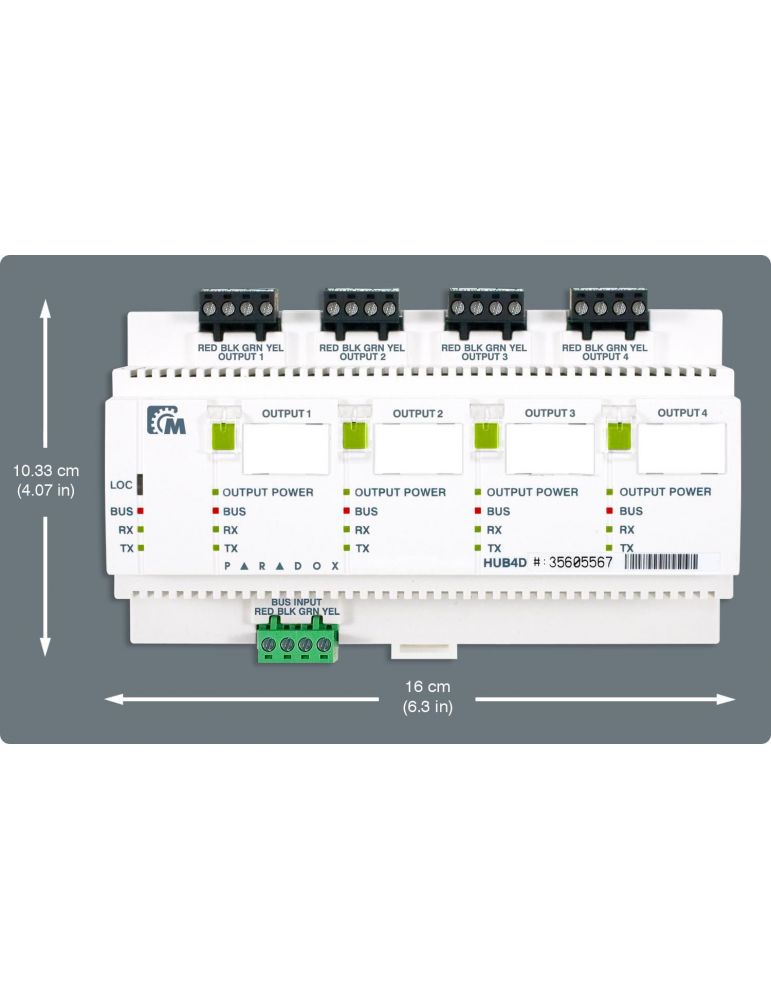 Modul izolator Bus Paradox HUB4D cu 4 porturi: multiplică magistrala de date în 4 magistrale izolate galvanic pentru protecţia împotriva descărcărilor de tensiune şi a diferenţelor de potenţial; izolarea face ca un defect pe o magistrală să nu influenţeze funcţionarea celorlalte; 1 port intrare; 4 porturi ieşire; fiecare port permite comunicaţia pe o distanţă de 900m; ideal pentru conectarea modulelor la distanţe mari (clădiri diferite); butoane frontale pentru activarea sau dezactivarea fiecărei ieşiri; LED-uri pentru afişarea stării per ieşire/ pentru indicarea stării de funcţionare; actualizare firmware via Multibus; montare pe şine DIN de 35mm