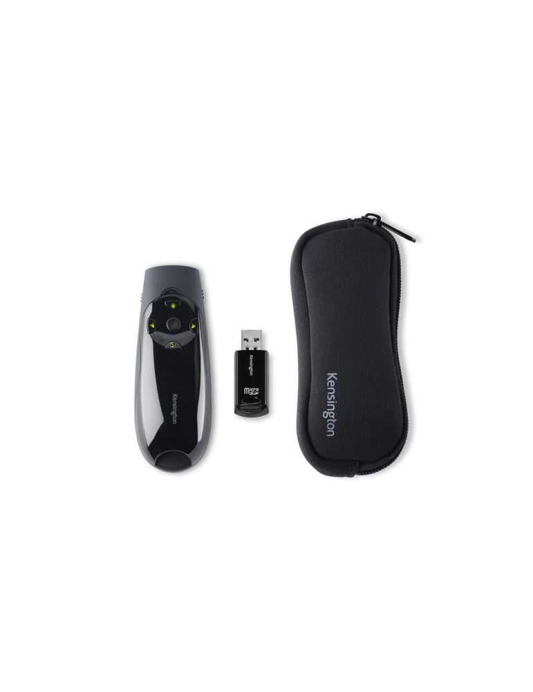 Kensington Presenter Expert. Tehnologia comunicaţiei fără fir: RF, Interfață receptor fără fir (wireless): USB, Tip receptor: Receptor standard. Culoarea produsului: Negru, Funcții prezentator: Indicator cu laser, Telecomandă, Culoare indicator cu laser: Verde. Lățime: 133 milimetri, Adâncime: 80 milimetri, Înălţime: 200 milimetri. Sisteme de operare Windows suportate: Windows 10,Windows 10 Education,Windows 10 Education x64,Windows 10 Enterprise,Windows 10..., Sisteme de operare Mac suportate: Mac OS X 10.11 El Capitan, Mac OS X 10.12 Sierra, Mac OS X 10.13 High Sierra, Mac OS X 10.14..., Sisteme de operare compatibile: macOS X 10.11; Windows 8; Windows 10. Cartela de memorie inclusă: MicroSD, Capacitatea cardului de memorie inclus: 8 Giga Bites
