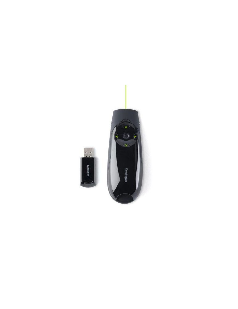 Kensington Presenter Expert. Tehnologia comunicaţiei fără fir: RF, Interfață receptor fără fir (wireless): USB, Tip receptor: Receptor standard. Culoarea produsului: Negru, Funcții prezentator: Indicator cu laser, Telecomandă, Culoare indicator cu laser: Verde. Sisteme de operare compatibile: Windows 8; Windows 10. Cantitate per ambalaj: 1 buc.