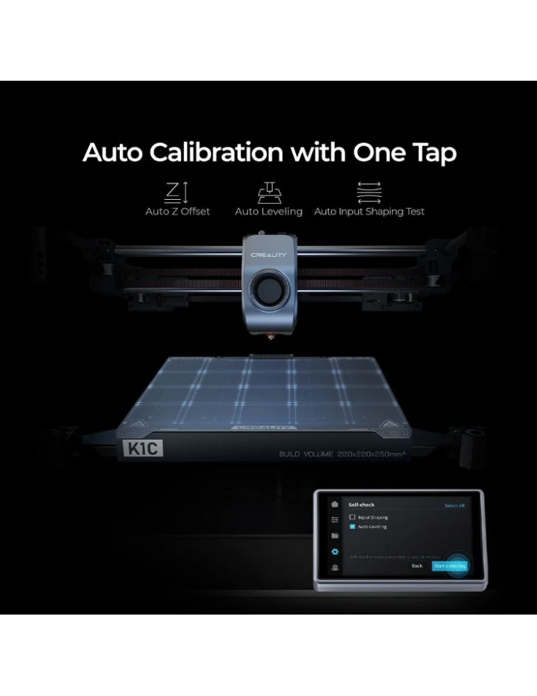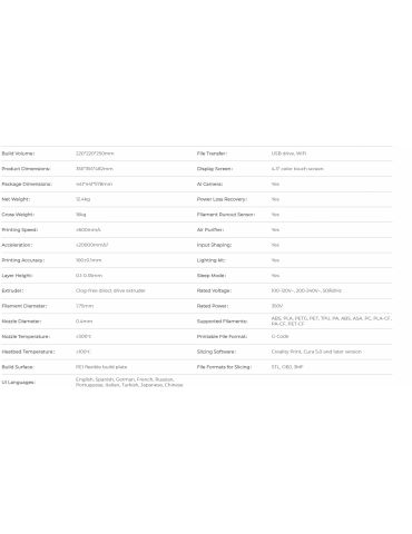 Imprimanta 3D Creality K1C ( Printare carbon) Tehnologie FDM viteza printare 600mm/s Precizie 100 +/-0.1mm Diametru filament: 1.75mm tip filament compatibil: ABS PLA PETG PET TPU PA ABS ASA PC PLA-CF PA-CF PET-CF Transfer fisier: USB driveWIFI temperatura duza:300 C Format: STL/OBJ/AMFSoftware: Creality Print compatibil cu Cura Simplify 3D PrusaSlicer Printing Size 220*220*250mm dimensiuni: 355*355*480mm greutate pachet : 16 kg dimensiuni pachet 415*415*550mm Sursa 350W.Display 4.3 touchscreen auto leveling.