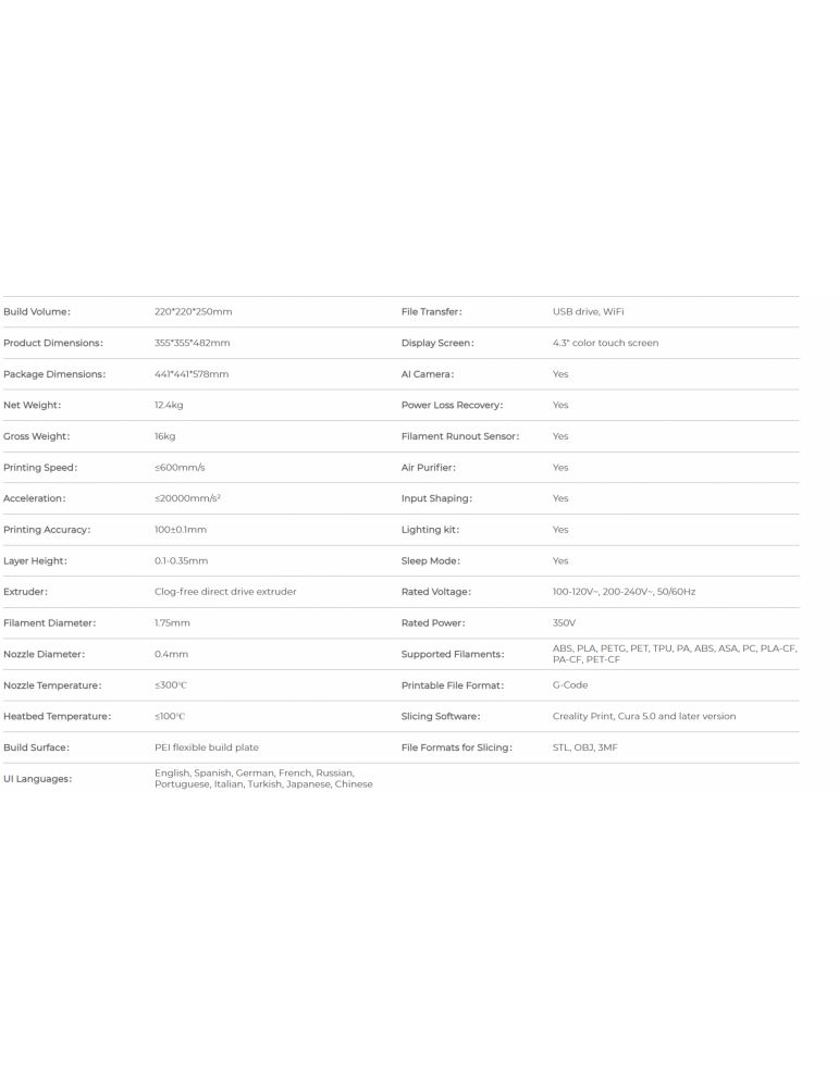 Fisa tehnica Imprimanta 3d creality k1c ( printare carbon) tehnologie fdm viteza