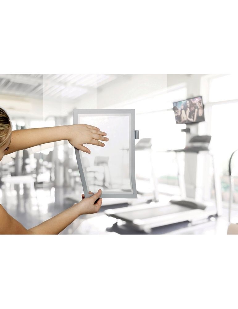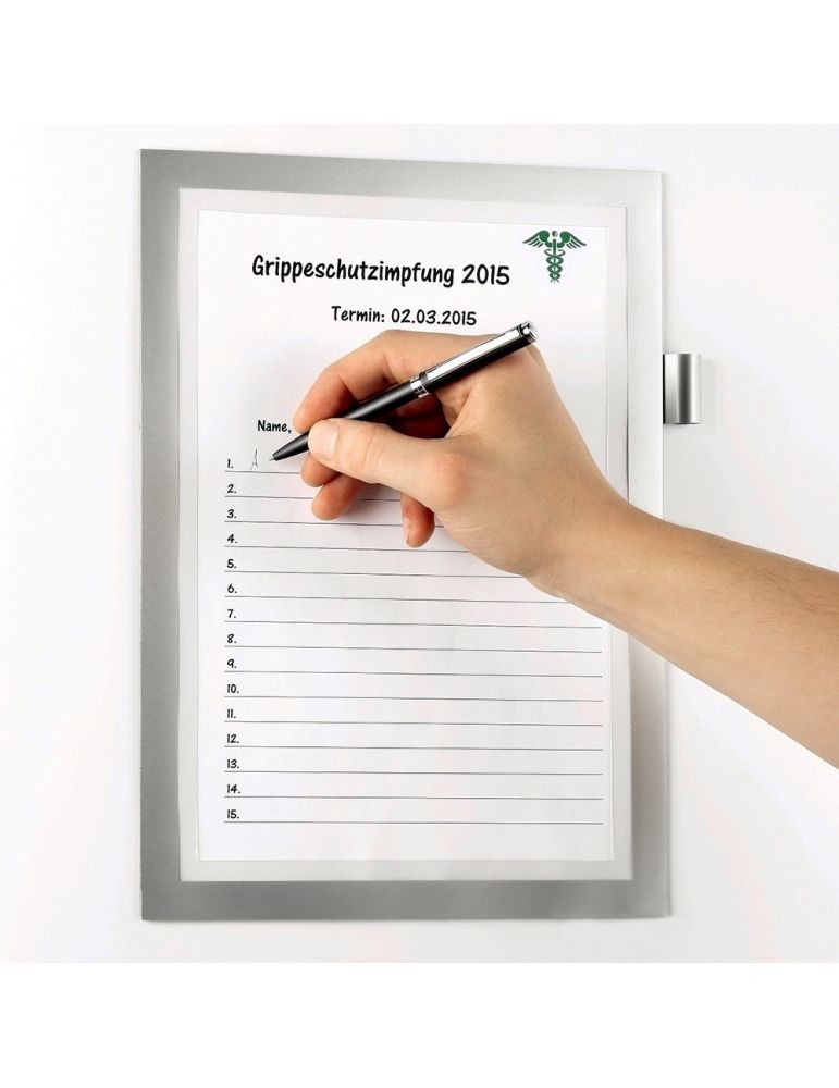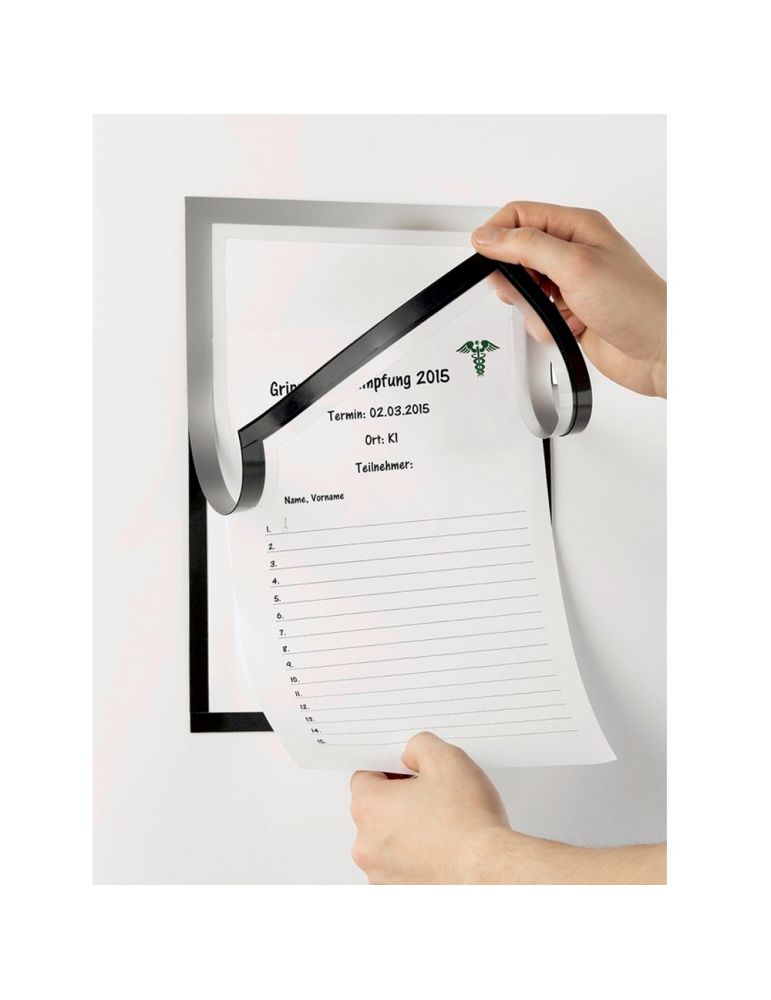 Sistem de afişare autoadeziv, cu rama frontala magnetica. Permite notarea directa pe insert. Schimbare rapida a insertului, capacitate mare de sutinere de pana la 5 coli, prevazut cu suport pentru pix. Insertul se poate schimba cu usurinta, datoriat ramei magnetice. Pozitionare verticala sau orizontala, spate autoadeziv pentru fixare pe orice suprafata neteda. Exemple domenii de utilizare: Curatenie (Ex: Program curatenie grup sanitar), Birou (Ex: Ultima revizie a echipamentelor de birou), Productie (Ex: Taskuri, etape proces productie, etc), Sali de fitness (Ex: Programul de exercitii).
