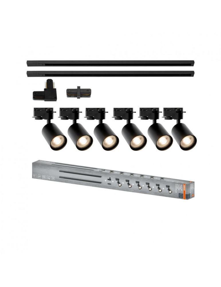 Sistem complet TRACKLIGHT OSRAM Elemental cu 6 proiectoare cu soclu GU10 si 2 sine monofazate de 1 metru, 1 conector liniar, 1 conector tip L, Negru