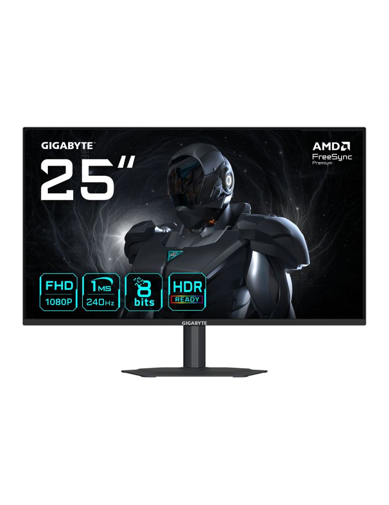 GIGABYTE G25F2A. Diagonala afișajului: 62,2 cm (24.5"), Rezoluţie de afişare: 1920 x 1080 Pixel, Tip HD: Full HD, Tehnologie de afișare: LED, Timp de răspuns: 1 ms, Raport de aspect nativ: 16:9, Unghiul de vizionare, orizontal: 178°, Unghiul de vizionare, vertical: 178°. Difuzoare încorporate. Montaj VESA, Ajustare a înălţimii. Culoarea produsului: Negru