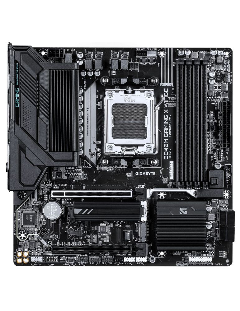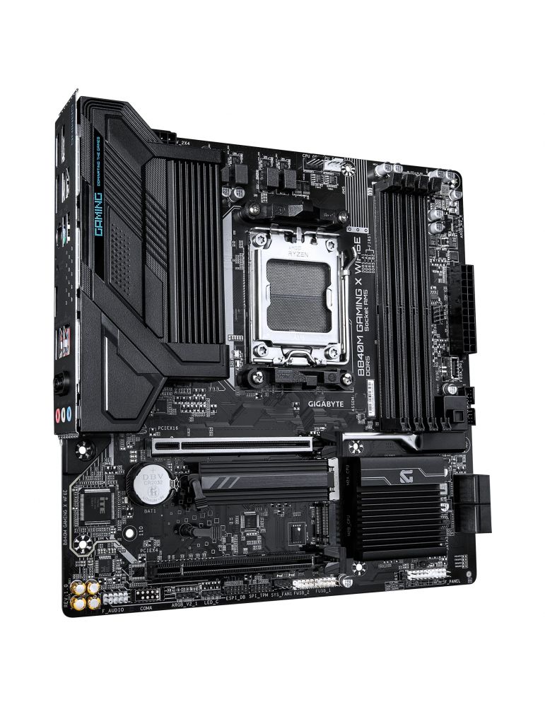 GIGABYTE B840M GAMING X WIFI6E. Producătorul procesorului: AMD, Priza Processor: Mufă AM5, Compatibilitate procesoare: AMD Ryzen 7000 Series, AMD Ryzen 8000 Series, AMD Ryzen 9000 Series. Tipuri de memorie suportate: DDR5-SDRAM, Maximum de memorie internă: 256 Giga Bites, Tip sloturi de memorie: DIMM. Interfețe drive stocare compatibile: M.2, PCI Express 4.0, SATA III, Tipuri discuri de stocare suportate: HDD & SSD, Niveluri RAID: 0, 1, 10, 5. Rezoluţia maximă: 4096 x 2160 Pixel. Tip interfață Ethernet: Gigabit Ethernet, Controler LAN: Realtek RTL8125, Standard Wi-Fi: Wi-Fi 6E (802.11ax)