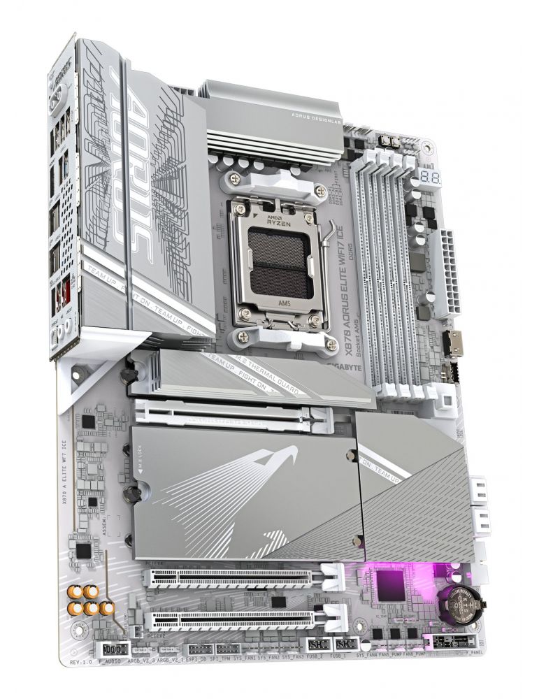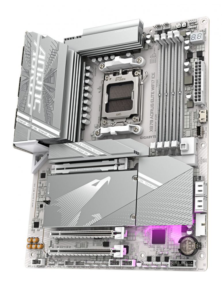 GIGABYTE X870 AORUS ELITE WIFI7 ICE. Producătorul procesorului: AMD, Priza Processor: Mufă AM5, Compatibilitate procesoare: AMD Ryzen 7000 Series, AMD Ryzen 8000 Series, AMD Ryzen 9000 Series. Tipuri de memorie suportate: DDR5-SDRAM, Maximum de memorie internă: 256 Giga Bites, Tip sloturi de memorie: DIMM. Interfețe drive stocare compatibile: M.2, Tipuri discuri de stocare suportate: HDD & SSD, Niveluri RAID: 0, 1, 10. Rezoluţia maximă: 4096 x 2160 Pixel, Model adaptor grafic la-bord: AMD Radeon Graphics. Tip interfață Ethernet: 2.5 Gigabit Ethernet, Controler LAN: Realtek RTL8125, Standard Wi-Fi: Wi-Fi 7 (802.11be)