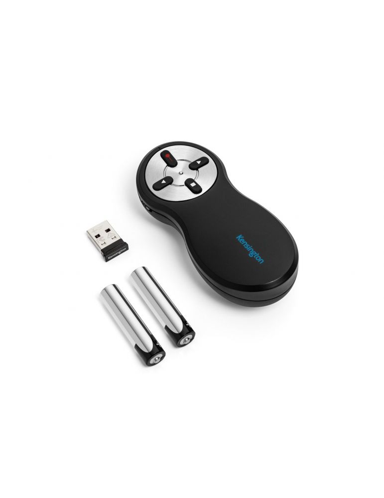 Kensington 33374EU. Tehnologia comunicaţiei fără fir: RF, Interfață receptor fără fir (wireless): USB, Tip receptor: Receptor nano. Tip baterie: AAA. Culoarea produsului: Negru, Funcții prezentator: Indicator cu laser, Telecomandă, Culoare indicator cu laser: Roşu. Greutate: 100 g. Sisteme de operare compatibile: XP; macOS X 10.11; Vista; Windows 7; Windows 10; Windows 8