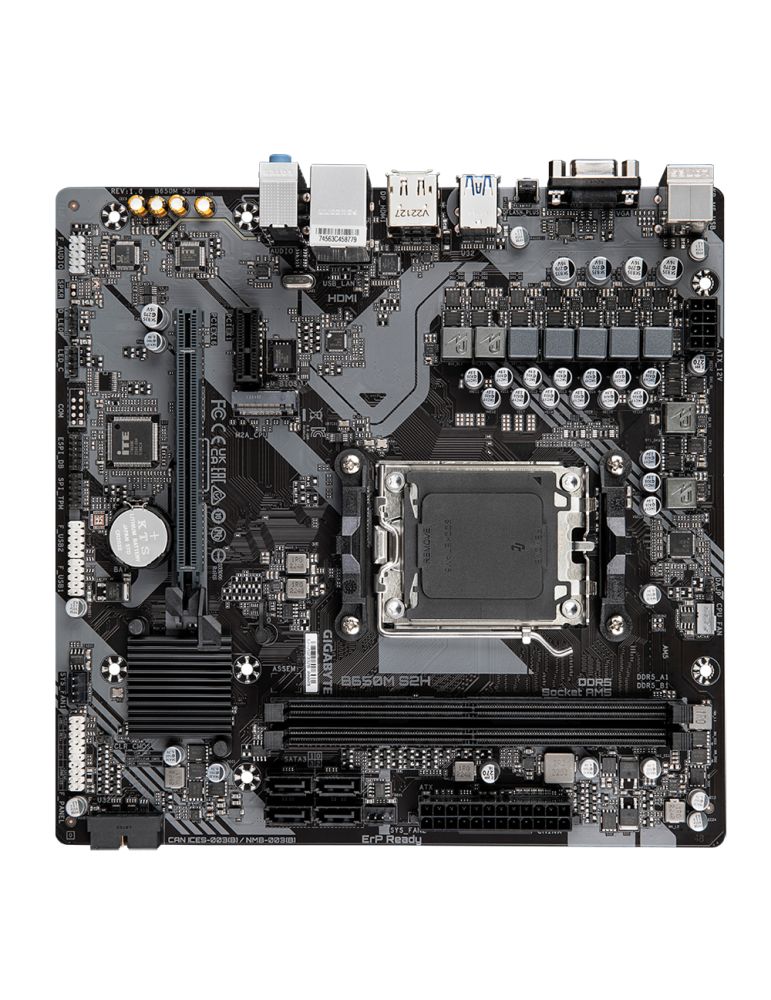 Placa de baza GIGABYTE B650M S2H | Socket AM5 | 4 x DDR5 DIMM (up to 96GB) | Audio Realtek CODEC | 1 x Realtek® GbE LAN chip (1 Gbps/100 Mbps/10 Mbps) | 1 x PCI Express x16, 1x PCI Express x1| 1 x Q-Flash Plus button, 1 x DisplayPort, 1 x HDMI port, 2 x USB 3.2 Gen 1 ports, 4 x USB 2.0/1.1 ports, 1 x RJ-45 port, 3 x audio jacks| mATX