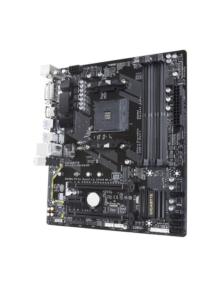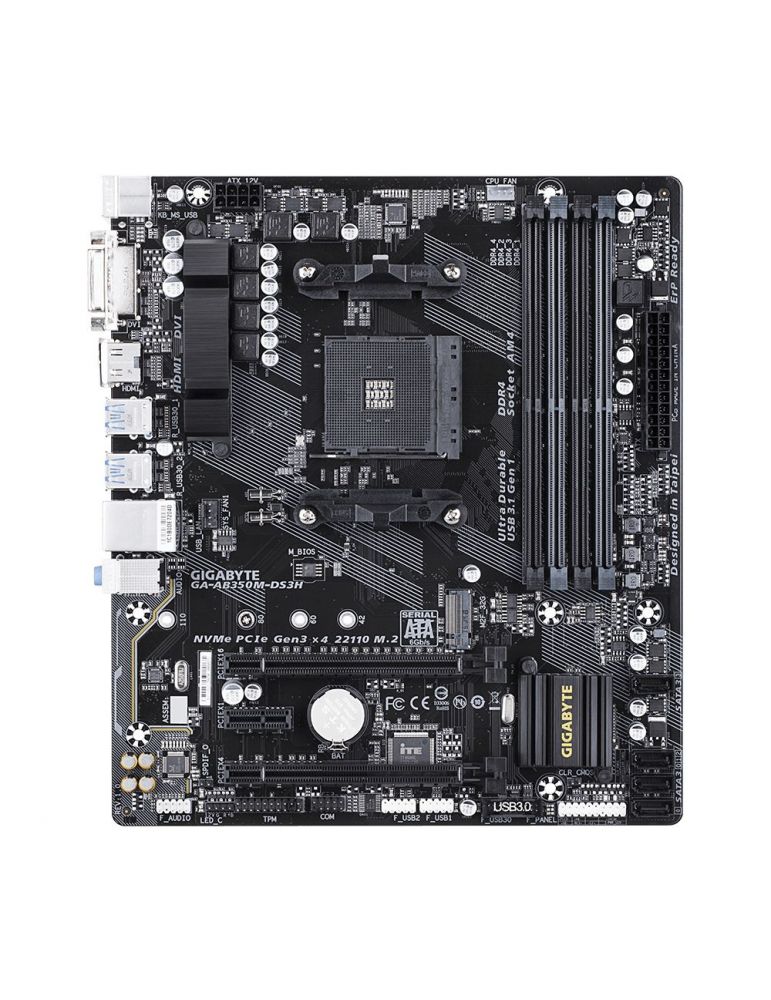 Gigabyte GA-AB350M-DS3H. Producătorul procesorului: AMD, Priza Processor: Mufă AM4, Compatibilitate procesoare: AMD A, AMD Athlon, AMD Athlon™ X4, AMD Ryzen™ 3, 2nd Generation AMD Ryzen™ 3, 3rd Generation.... Tipuri de memorie suportate: DDR4-SDRAM, Maximum de memorie internă: 64 Giga Bites, Tip sloturi de memorie: DIMM. Niveluri RAID: 0, 1, 10. Rezoluţia maximă: 4096 x 2160 Pixel. Tip interfață Ethernet: Gigabit Ethernet