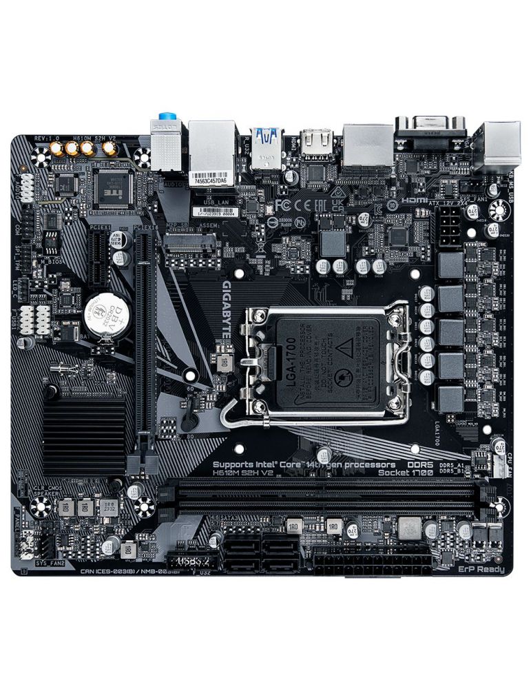 Gigabyte H610M S2H V2. Producătorul procesorului: Intel, Priza Processor: LGA 1700, Compatibilitate procesoare: Intel® Celeron®, Intel® Core™ i3, Intel® Core™ i5, Intel® Core™ i7, Intel® Core™ i9,.... Tipuri de memorie suportate: DDR5-SDRAM, Maximum de memorie internă: 96 Giga Bites, Tip sloturi de memorie: DIMM. Interfețe drive stocare compatibile: M.2, SATA, Tipuri discuri de stocare suportate: HDD & SSD. Familie adaptoare grafice: Intel, Adaptor grafic: HD Graphics, Rezoluţia maximă: 4096 x 2304 Pixel. Tip interfață Ethernet: Gigabit Ethernet