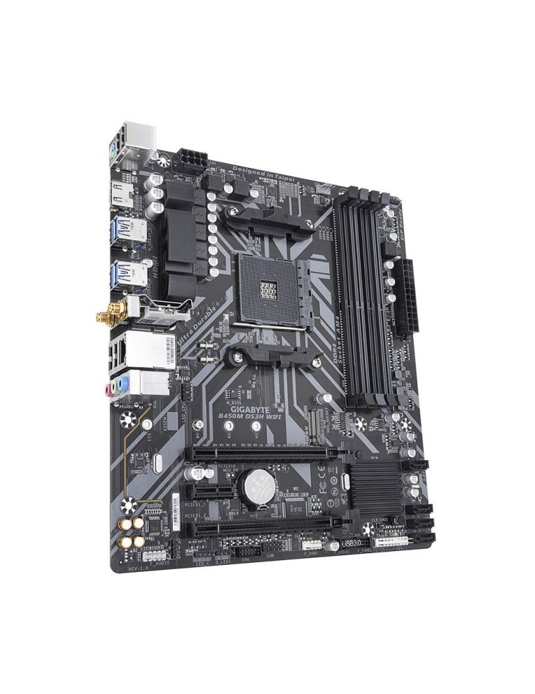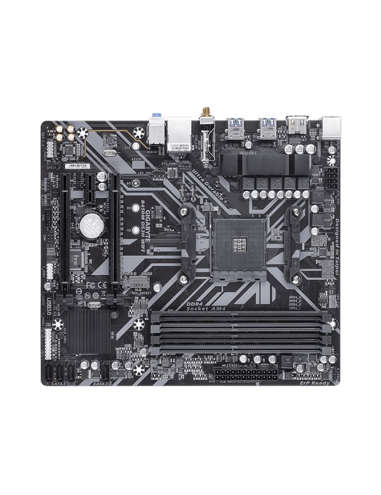 GIGABYTE B450M DS3H WIFI (rev. 1.5). Producătorul procesorului: AMD, Priza Processor: Mufă AM4, Compatibilitate procesoare: AMD Ryzen 3000 Series, AMD Ryzen 2000 Series. Tipuri de memorie suportate: DDR4-SDRAM, Maximum de memorie internă: 128 Giga Bites, Tip sloturi de memorie: DIMM. Interfețe drive stocare compatibile: M.2, SATA III, Tipuri discuri de stocare suportate: HDD & SSD, Niveluri RAID: 0, 1, 10. Adaptor de memorie grafică maximă: 16000 Mega bites, Rezoluţia maximă: 4096 x 2160 Pixel. Conector USB: USB Tip-A