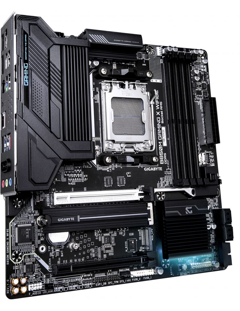 GIGABYTE B850M GAMING X WIFI6E. Producătorul procesorului: AMD, Priza Processor: Mufă AM5, Compatibilitate procesoare: AMD Ryzen 7000 Series, AMD Ryzen 8000 Series, AMD Ryzen 9000 Series. Tipuri de memorie suportate: DDR5-SDRAM, Maximum de memorie internă: 256 Giga Bites, Tip sloturi de memorie: DIMM. Interfețe drive stocare compatibile: M.2, SATA III, Tipuri discuri de stocare suportate: HDD & SSD, Niveluri RAID: 0, 1, 10. Rezoluţia maximă: 4096 x 2160 Pixel. Tip interfață Ethernet: 2.5 Gigabit Ethernet, Standard Wi-Fi: Wi-Fi 6E (802.11ax), Standarde Wi-Fi: 802.11a, 802.11b, 802.11g, Wi-Fi 4 (802.11n), Wi-Fi 5 (802.11ac), Wi-Fi 6 (802.11ax), Wi-Fi 6E...