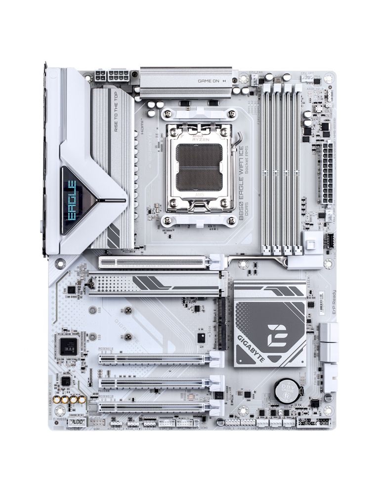 GIGABYTE B850 EAGLE WIFI7 ICE. Producătorul procesorului: AMD, Priza Processor: Mufă AM5, Compatibilitate procesoare: AMD Ryzen 7000 Series, AMD Ryzen 8000 Series, AMD Ryzen 9000 Series. Tipuri de memorie suportate: DDR5-SDRAM, Maximum de memorie internă: 256 Giga Bites, Tip sloturi de memorie: DIMM. Interfețe drive stocare compatibile: M.2, PCI Express 4.0, PCI Express 5.0, SATA III, Tipuri discuri de stocare suportate: HDD & SSD, Niveluri RAID: 0, 1, 10. Rezoluţia maximă: 4096 x 2160 Pixel. Tip interfață Ethernet: 2.5 Gigabit Ethernet, Controler LAN: Realtek RTL8125, Standard Wi-Fi: Wi-Fi 7 (802.11be)