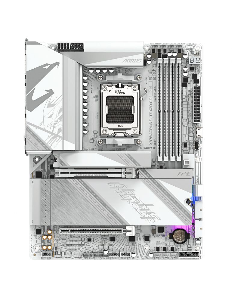 GIGABYTE X870 AORUS ELITE X3D ICE. Producătorul procesorului: AMD, Priza Processor: Mufă AM5, Compatibilitate procesoare: AMD Ryzen 7000 Series, AMD Ryzen 8000 Series, AMD Ryzen 9000 Series. Tipuri de memorie suportate: DDR5-SDRAM, Maximum de memorie internă: 256 Giga Bites, Tip sloturi de memorie: DIMM. Interfețe drive stocare compatibile: M.2, PCI Express 4.0, PCI Express 5.0, SATA III, Tipuri discuri de stocare suportate: HDD & SSD, Niveluri RAID: 0, 1, 5, 10. Rezoluţia maximă: 4096 x 2304 Pixel. Tip interfață Ethernet: 2.5 Gigabit Ethernet, 5 Gigabit Ethernet, Fast Ethernet, Gigabit Ethernet, Controler LAN: Realtek RTL8126, Standard Wi-Fi: Wi-Fi 7 (802.11be)