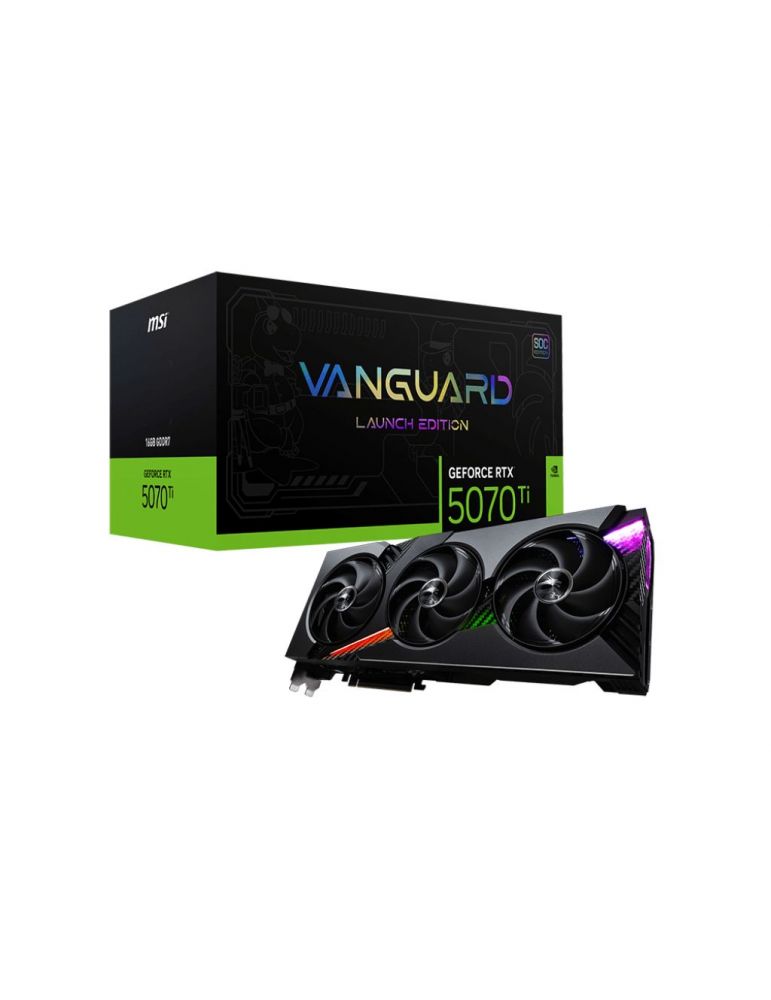 MSI GEFORCE RTX 5070 TI 16G VANGUARD SOC LAUNCH EDITION. Familie procesor grafic: NVIDIA, Procesor grafic: GeForce RTX 5070 Ti. Adaptor memorie discrete graphics: 16 Giga Bites, Tipul de memorie a adaptorului grafic: GDDR7, Autobuz de memorie: 256 bit. Rezoluţia maximă: 7680 x 4320 Pixel. Versiune DirectX: 12 Ultimate, Versiune OpenGL: 4.6. Tipul de interfaţă: PCI Express 5.0. Tipul de răcire: Activ, Numărul de ventilatoare: 3 ventilator(ventilatoare), Culoare iluminare: Multi
