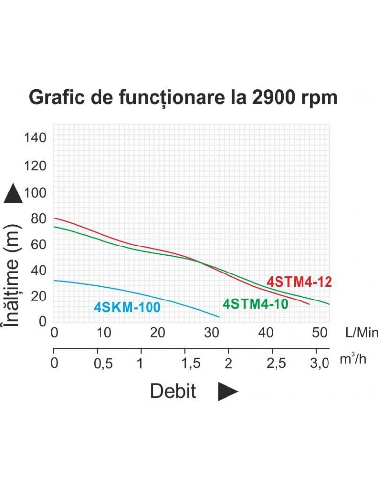 Descriere si avantaje Pompeaza apa curata neutra din punct de vedere chimic fara corpuri solide sau substante abrazive Motor in baie de ulei grad de protectie IP68 si 12 etaje Ax pompa din inox AISI304 Racord refulare din cupru Adecvata pentru puturi sau fantani de cel putin 100mm in diametru Carcasa separata pentru motor si etaje de pompare Turbina din plastic si difuzor supapa de sens Date tehnice Tensiune de alimentare: 230 V Putere: 1100 W Debit maxim: 67 l/min Etaje pompare: 12 Frecventa: 50 Hz Diametru pompa: 4 inch Inaltime refulare maxima: 96 m Tip unitate pompare: rotor material plastic Set livrare cutie de control cu stecher banda izolatoare cablul de alimentare se achizitioneaza separat