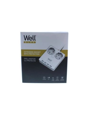 Prelungitor Well, 2x Schuko, 4x USB, protecție la supratensiune, 3m