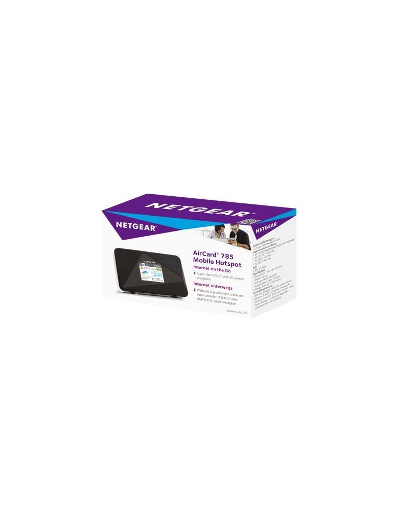 Netgear AirCard 785 Mobile Hotspot. Tip de dispozitiv: Echipament rețea wireless celulară, Culoarea produsului: Negru, Material carcasă: Din material plastic. Standarde Wi-Fi: 802.11b,802.11g,Wi-Fi 4 (802.11n). Rețea de date: 2G, 3G, 4G, Edge, GSM, HSPA+, LTE, Standarde 2G: Edge, GSM, Standarde 3G: HSPA+. Carduri de memorie compatibile: MicroSD (TransFlash). Sisteme de operare Windows suportate: Windows 7,Windows 8,Windows RT,Windows Vista,Windows XP, Sisteme de operare Mac suportate: Mac OS X 10.6 Snow Leopard,Mac OS X 10.7 Lion,Mac OS X 10.8 Mountain Lion