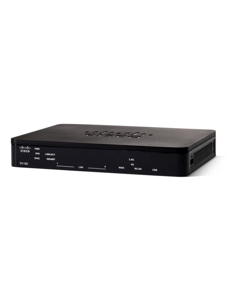 Cisco RV160 VPN Router. Reţea standard: IEEE 802.1x, Tip interfață Ethernet: Gigabit Ethernet, Tehnologia cablării: 10/100/1000Base-T(X). Routing de protocol: RIP-1,RIP-2,RIPng, Protocoale de administrare: SNMP. Algoritmi de securitate: IPSec. Culoarea produsului: Negru, Gri. Tip de sursă de curent: DC