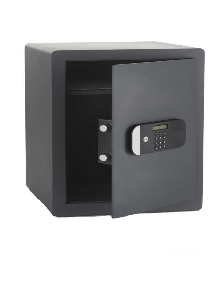 Seif de maxima securitate Yale, 520x350x360 mm YSEM/520/EG1; Caracteristici: Ușa tăiată cu laser-întărită cu placă armată anti- forare; Mecanism deschidere ușă automat; Încuietoare motorizată cu nivel de securitate ridicat; Blocare timp de 1min în cazul introducerii unui cod greșit de 3 ori; Display LCD clar cu tastatură; Luminat la interior pentru a fi văzut ușor conținutul; Cârlige la interior pentru a agăța chei sau alte obiecte mici; Terminal extern 9V (dacă se termină bateriile interne, poate fi folosit pentru a deschide seiful); Baterii incluse; Volum: 49.8L;