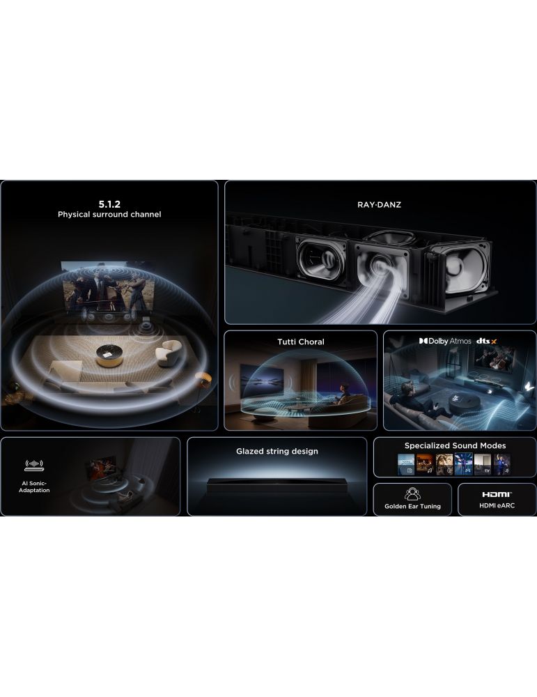 TCL Q Q75H, 5.1.2 canale, 620 W, DTS-HD Master Audio, DTS:X, Dolby Atmos, Dolby Digital Plus, Dolby MAT, Dolby Surround, Dolby TrueHD, Joc, Film, Muzică, Sport, Standard, Voce, 48 kHz, 30 W
