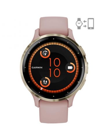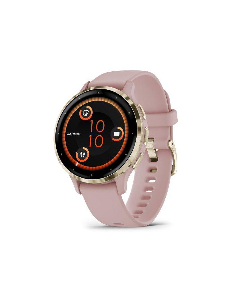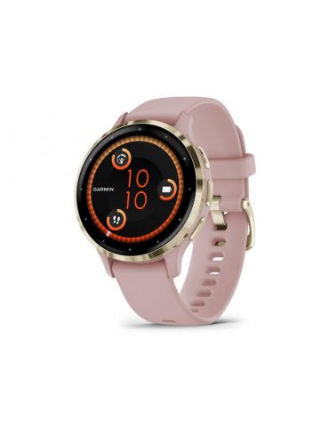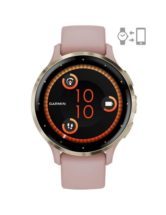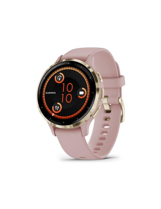 Ceas smartwatch Garmin Venu 3S display AMOLED dimensiune afisaj 30.4 mm rezolutie afisaj 390 x 390 pixeli memorie 8GB autonomie pana la 10 zile rezistanta la apa pana la 5 ATM ramă din oţel inoxidabil Soft Gold cu carcasă Dust Rose şi curea din silicon greutate: 40g