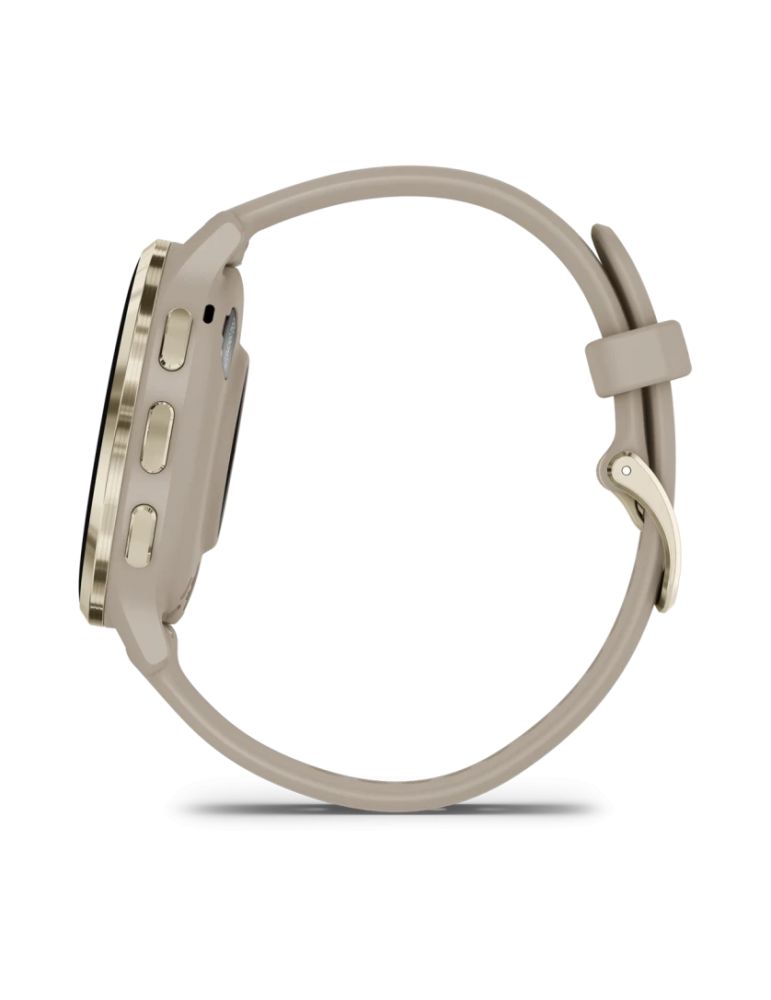 Ceas smartwach Garmin Venu 3S display AMOLED dimensiune afisaj 30.4 mm rezolutie afisaj 390 x 390 pixeli memorie 8GB autonomie pana la 10 zile rezistanta la apa pana la 5 ATM ramă din oţel inoxidabil Soft Gold cu carcasă French Gray şi curea din silicon greutate: 40g