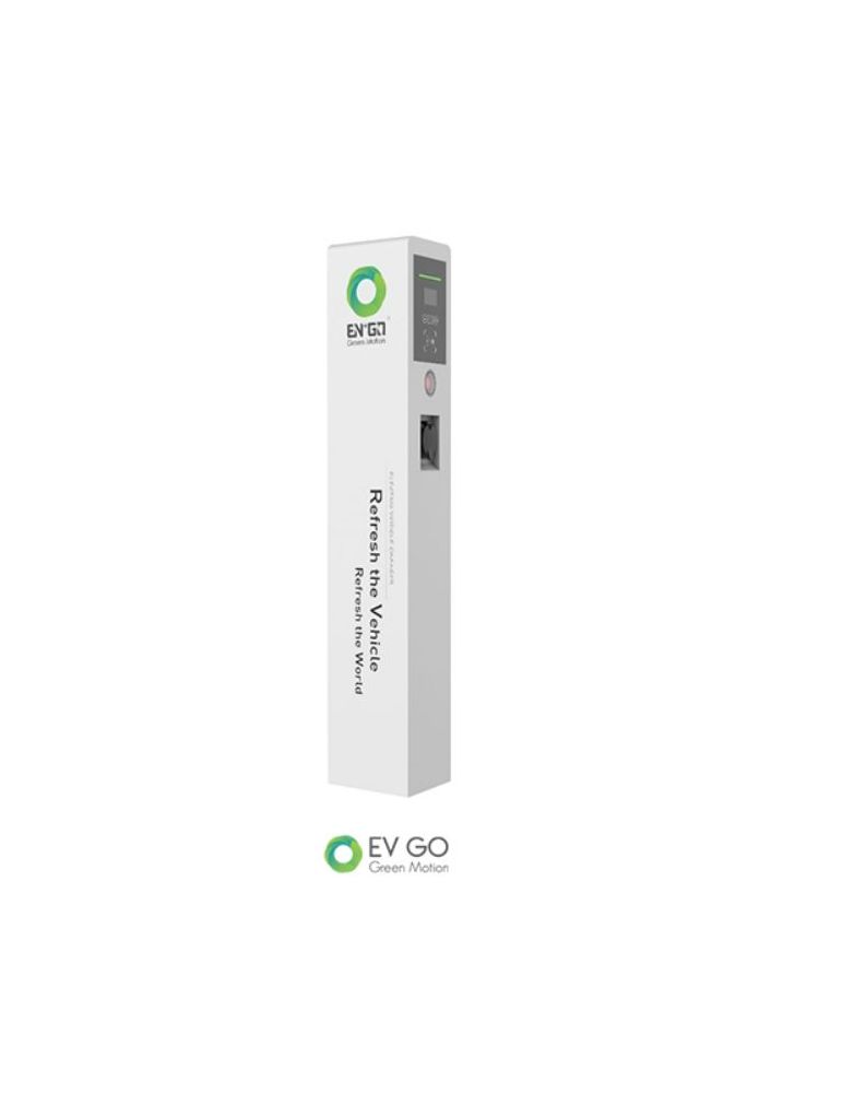 Statie incarcare simultana 2 autovehicule electrice EVGO Business Line AC 2x22kW-Type 2 380V Piedestal Carcasa metalica cu doua panouri frontale din sticla tempered LCD ecran cititor card RFID 2 carduri incluse IP 54 2 prize Type 2 OCPP 1.6 (JSON) incarcare simultana 2 autovehicule electrice aplicatie de management si plata EvGo Smart Charge instalata functie Smart Charging (Load balancing solution)