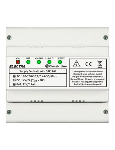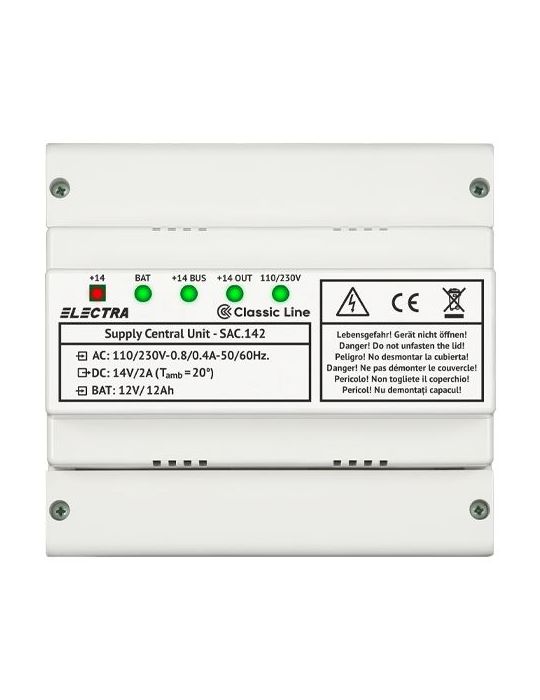 Produsele din gama CLASSIC realizeaza o combinatie optima de functiuni, in scopul de a asigura un plus de siguranta si confort. Robuste si rezistente, toate elementele acestei game de produse sunt usor de instalat si simplu de utilizat. Sursa de alimentare basic SAC.142 are urmatoarele caracteristici: - Carcasa din ABS ignifugat/PA66 - Montaj pe sina - Conectori surub: retea, panou, coloana, dispozitiv auxiliar, baterie 12V/12Ah, Caracteristici tehnice: Dimensiune: 240 x 190 x 84 mmmTensiune de alimentare: 110/230Vc.a. – 50/60HzTensiune de iesire: 14Vc.c./ 2Ac.c./20OCLED-uri diagnoza: +14, +14OUT, +14AUX, 110/230V, BATCuloare: albProtectii: supratensiune, scurtcircuit la iesire (4 Ac.c.), supratemperaturaModel / producator: ElectraTip: Sursa de alimentare in comutatie cu back-upTensiune de alimentare: 110/230Vc.a. â 50/60HzTensiune de iesire: 14Vc.c./ 2Ac.c./20 CDimensiuni: 240 x 190 x 84 mmmMaterial carcasa: ABS ignifugat PA66Montaj: sina DINConexiuni: Retea 230V panou dispozitiv auxiliar coloana baterie 12V/12Ah