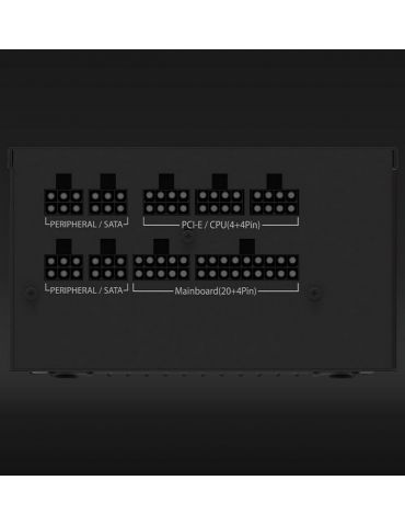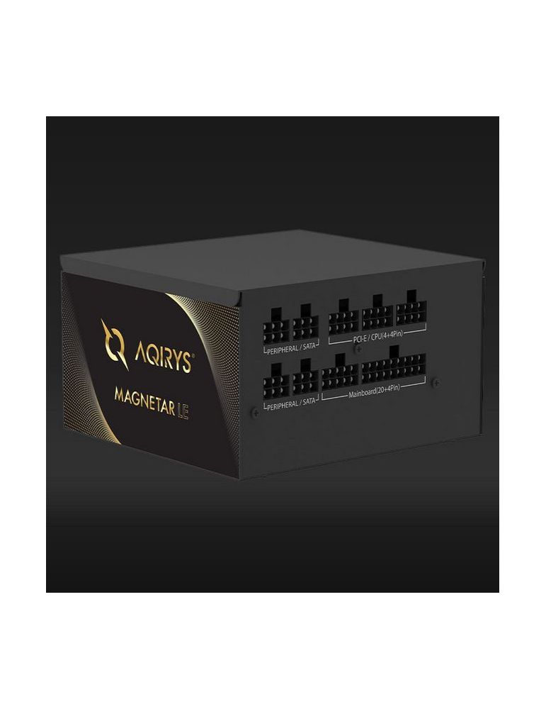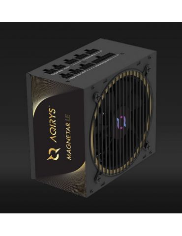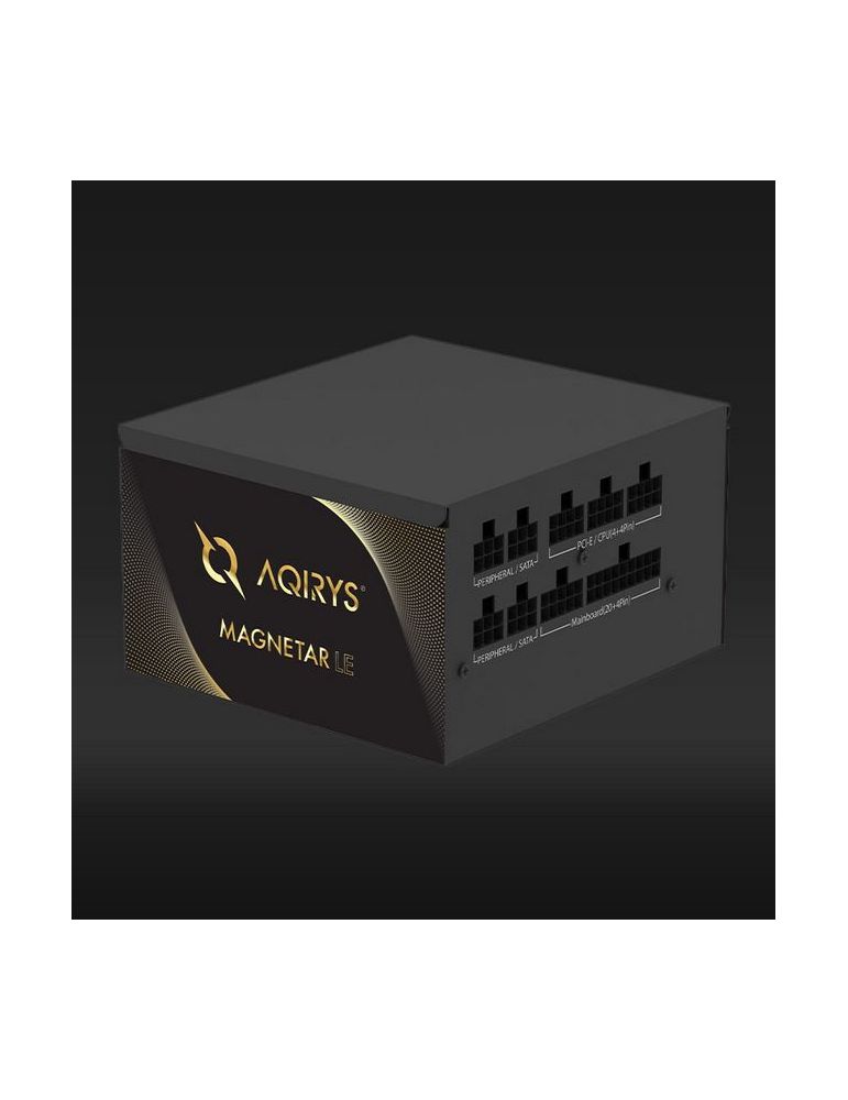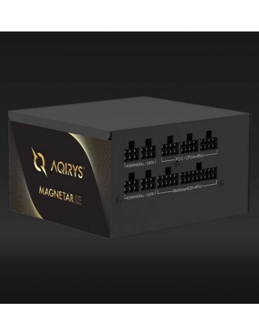 Sursa Aqirys Magnetar LE 750W 80 Gold Plus TECHNICAL DATA Continuous power: 750W Form factor: ATX ATX Version: ATX V2.52 Efficiency: 80PLUS® Gold certified Intel® C6/C7: Yes PFC: Active Illumination: No Modular cables: Yes Cable type: Flat black Fan size: 120 mm Fan speed: Temperature controlled Fan technology: Hydro Dynamic Bearing AC Input: 200 - 240V 15A 50/60Hz DC Output +3.3V: 16A DC Output +5V: 16A DC Output +12V1: 62.5A DC Output -12V: 0.3A DC Output +5Vsb: 2.5A MB connector: 1x 20+4P CPU connector: 1x 4+4P PCIe connector: 2x (2x 6+2P) SATA connector: 6x Molex connector: 3x 4P Protections: OOP UVP OVP SCP NLO SIP Environmental compliance: RoHS WEEE ErP Lot 6 Dimensions (LxWxH): 140 x 150 x 86 mm Weight: 1654 g Color: Black