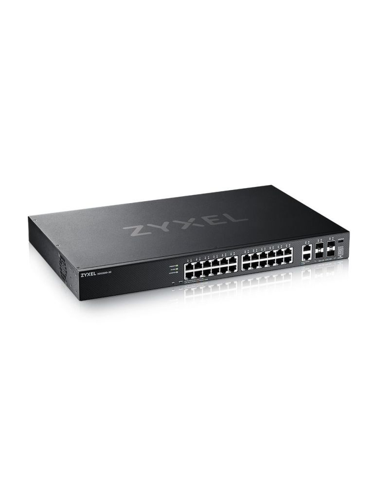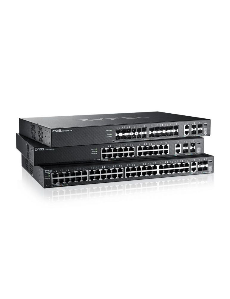 Zyxel XGS2220-30. De tip Switch: Gestionate, Strat Switch: L3. Tip de porturi Ethernet Basic switching RJ-45: Gigabit Ethernet (10/100/1000), Număr de porturi Ethernet Basic switching RJ-45: 24, Cantitate module SFP+ instalate: 4. Mărimea tabelei de adresare: 32000 intrari, Capacitatea de comutare: 168 Gbit/s. Reţea standard: IEEE 802.1Q, IEEE 802.1ab, IEEE 802.1p, IEEE 802.1x, IEEE 802.3ab, IEEE 802.3ae, IEEE 802.3an,.... Raft pentru montat echipamente